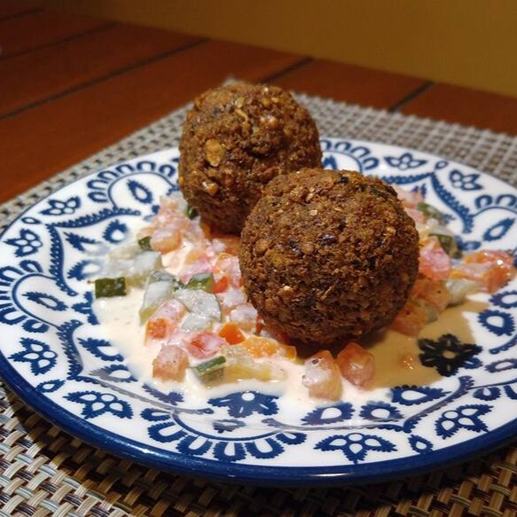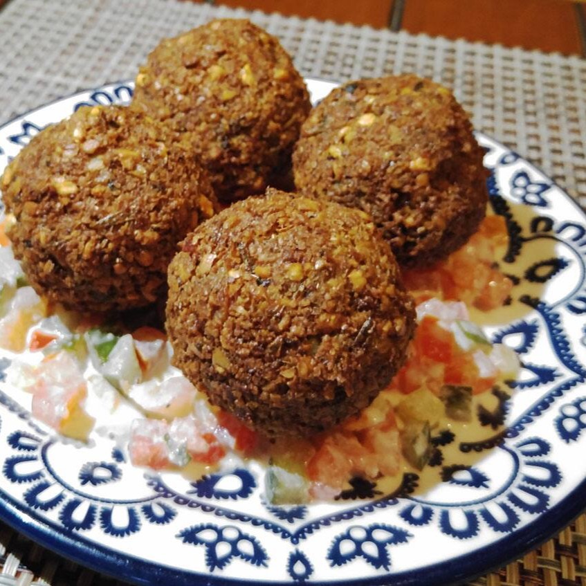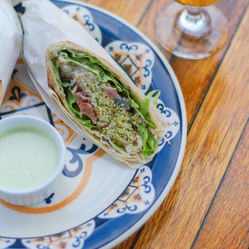 Falafel, alface, tahine, tomate, pepino em conserva e babaganuj