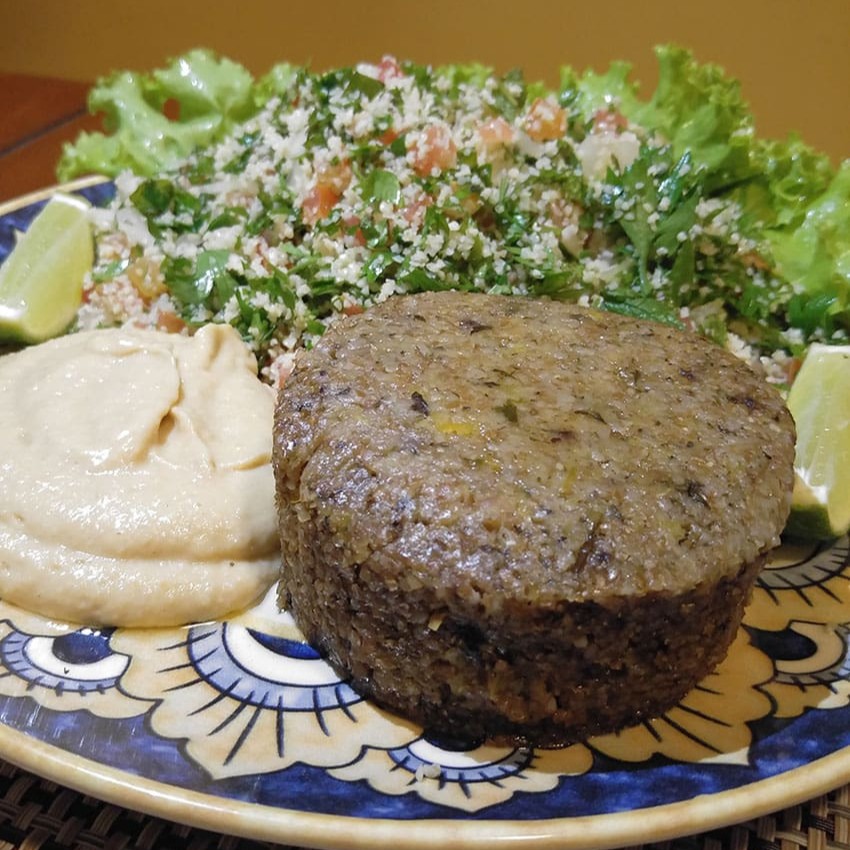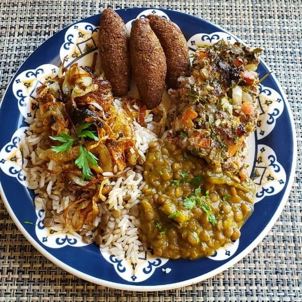 Arroz com lentilhas, kibe frito vegetariano, kafta bovina assada e lentilha com abóbora cabotiã.