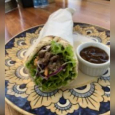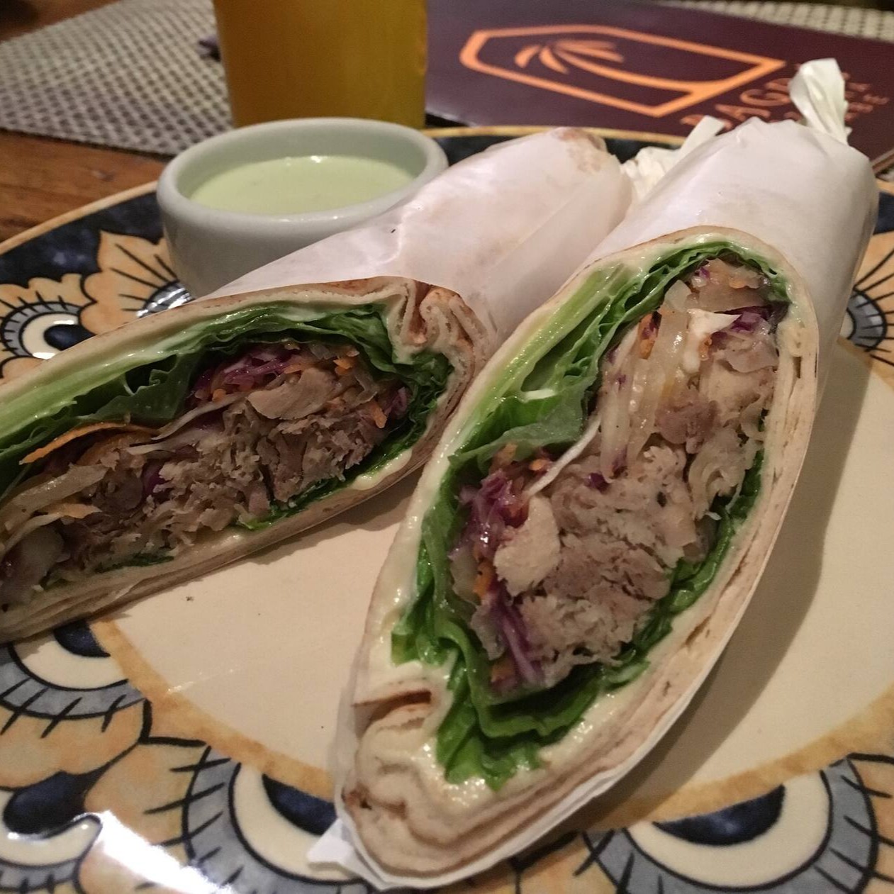 Pernil de cordeiro, alface, cebola, cenoura, pepino, repolho e homus