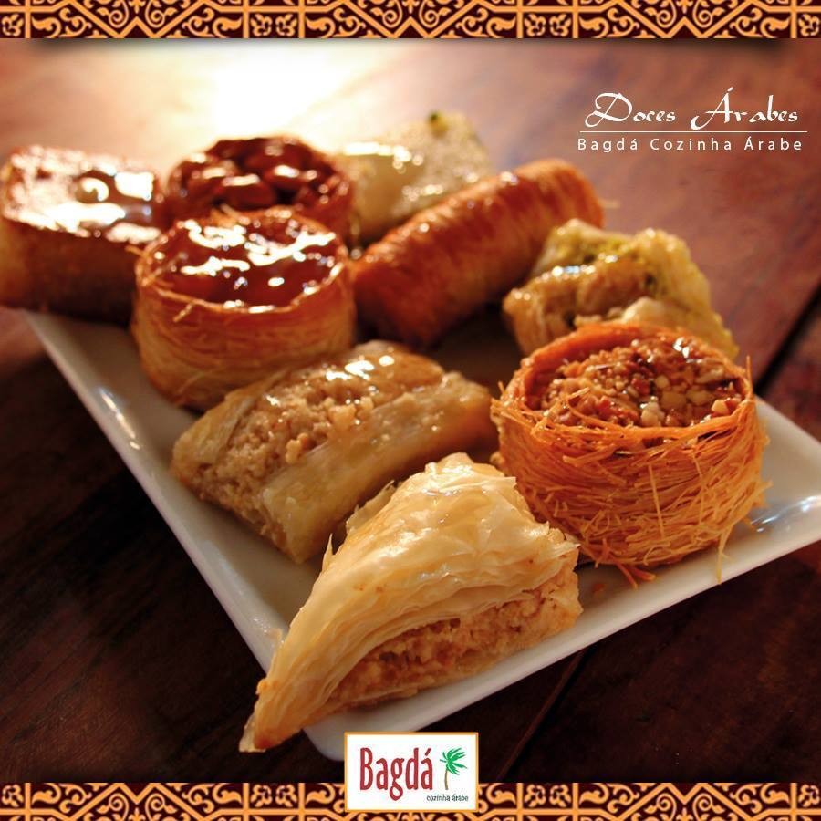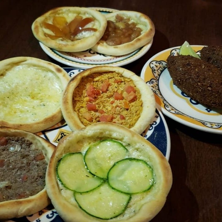 Quatro esfihas salgadas, dois kibes de 150g e duas esfihas doces.