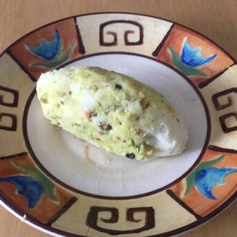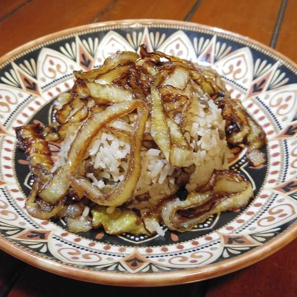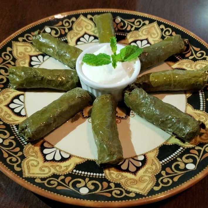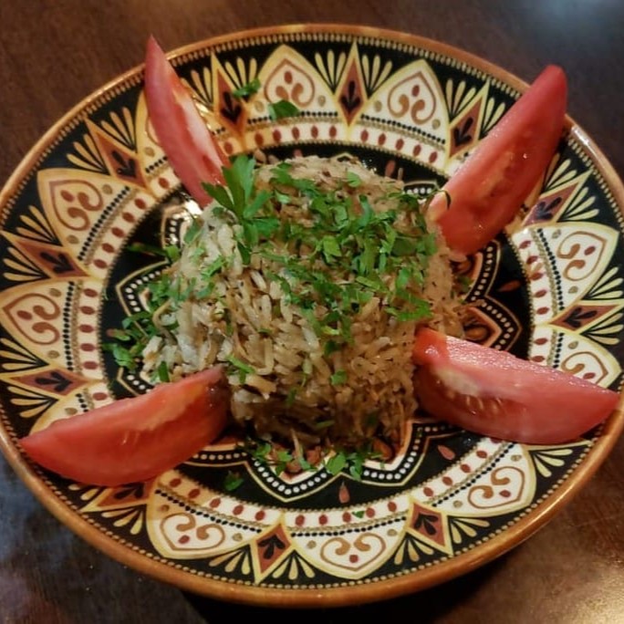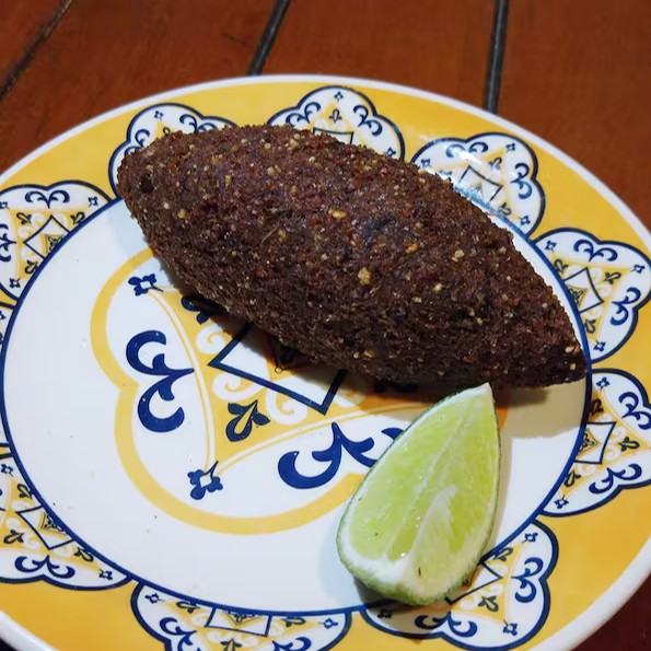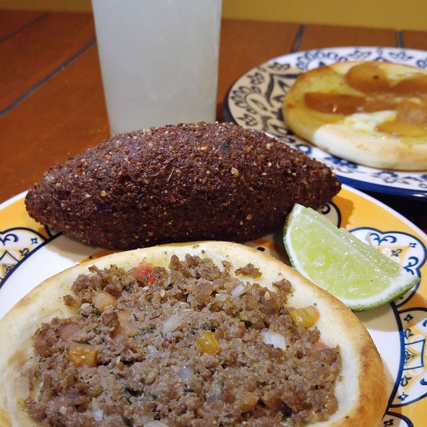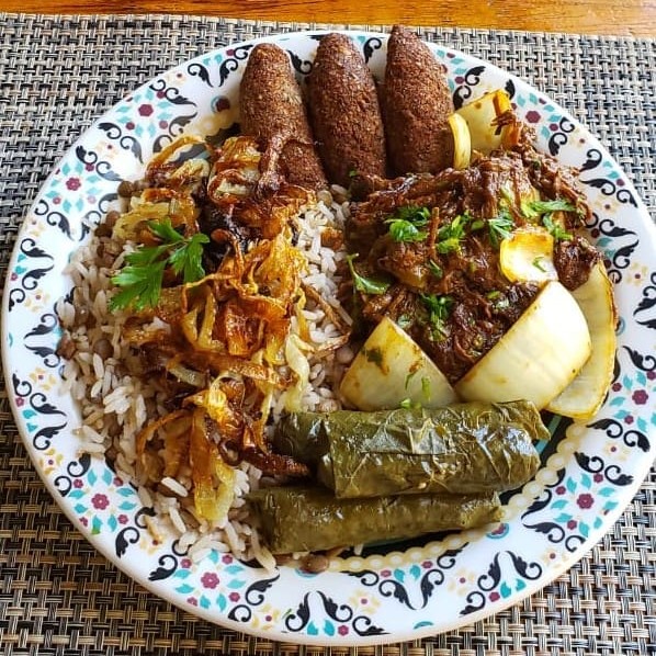 Pernil de cordeiro, charutinho de folha de uva, kibe frito, arroz com lentilha.