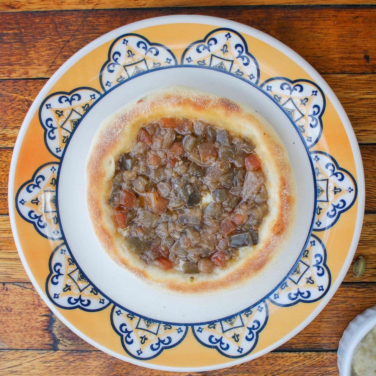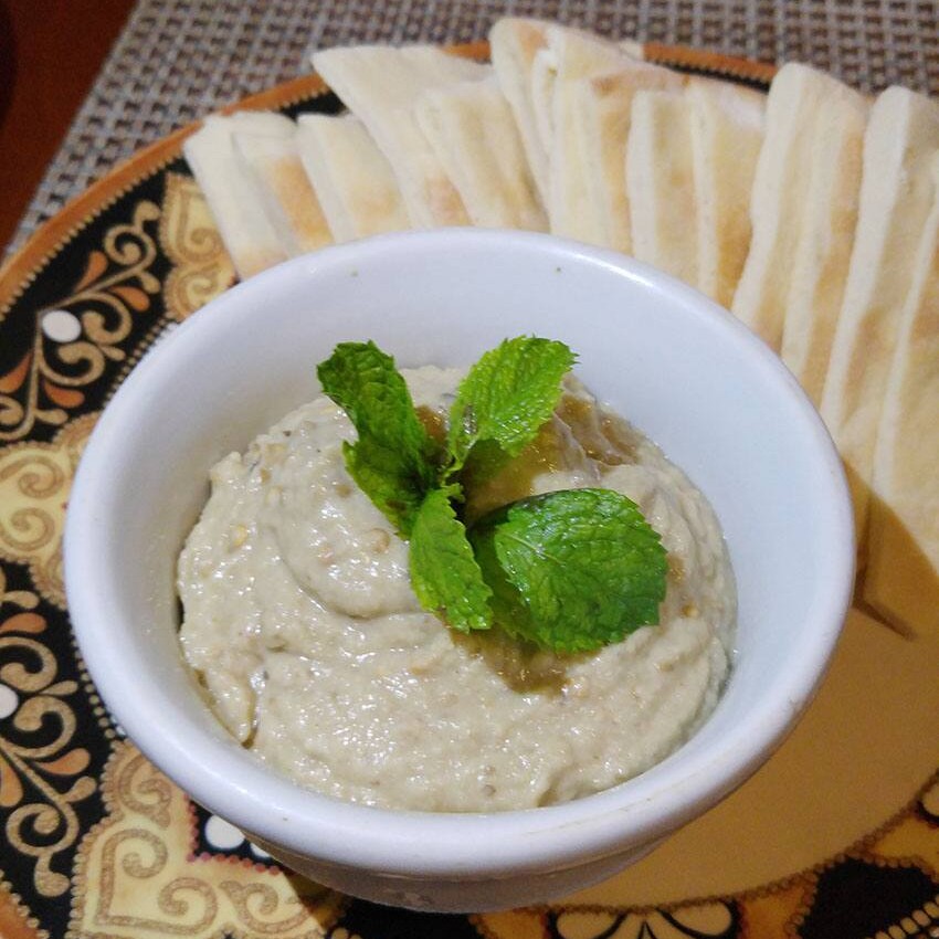 Berinjela defumada com tahine, limão e alho, (Acompanha dois pães sírios)