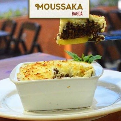 Iguaria grega com berinjela grelhada, carne temperada, batata cozida e gratinada ao molho branco, 500g.