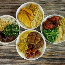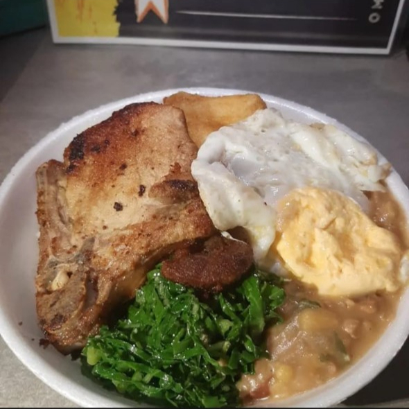 Arroz, Tutu de feijão, Couve refogada, Torresmo, Banana a milanesa, Bisteca frita , ovo frito