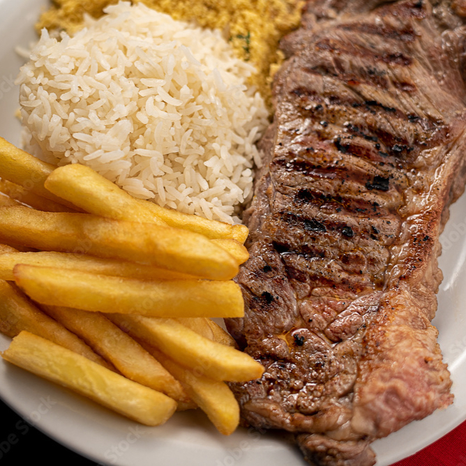 O prato acompanha arroz soltinho, feijão temperado no ponto certo e batatas fritas douradas e crocantes. Aproximadamente 600gr
