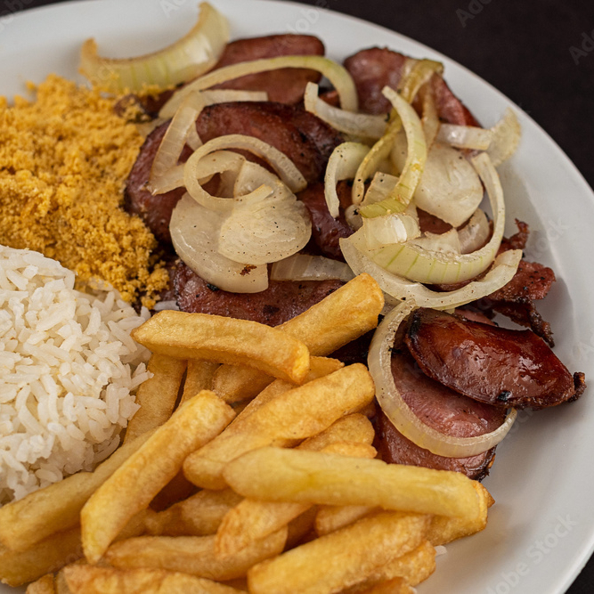 O prato acompanha arroz soltinho, feijão temperado no ponto certo, batatas fritas douradas e crocantes e farofa. Aproximadamente 600gr