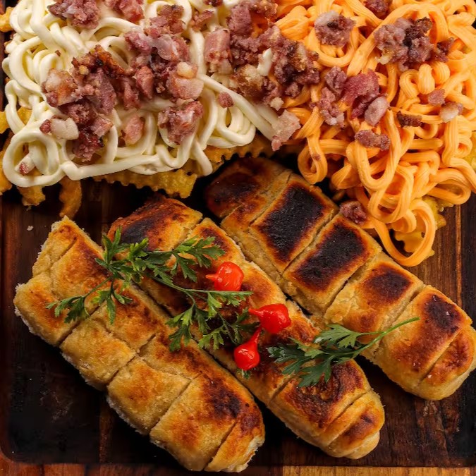 A 'Turbinada 2.0', campeã em vendas e estrela da categoria 'Porções Mais Pedidas', é a nossa emblemática e pioneira porção de sucesso. Ela apresenta irresistíveis batatas fritas turbinadas, generosamente revestidas com um cremoso cheddar e um suave Catupiry, finalizadas com crocantes pedaços de bacon. Acompanha 20 unidades de anéis de cebola perfeitamente empanados e uma robusta porção de 300g de calabresa, intensamente acebolada. Esta porção narra a nossa história, exibindo um sabor delicioso e autêntico, digno de apreciadores internacionais. É, sem dúvida, uma experiência gastronômica para ser saboreada!