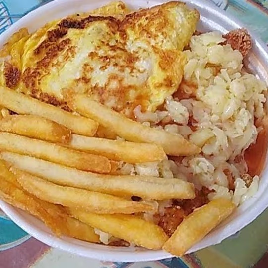 Arroz, feijão, Omelete com Queijo e Batata frita