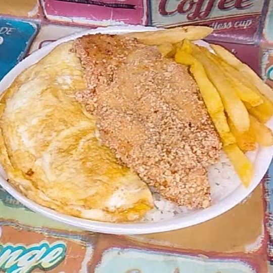 a Saboroso Omelete com Queijo e Frango Milanesa, e também Batata Frita.