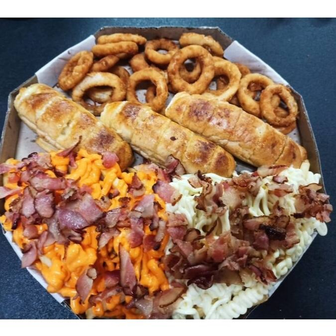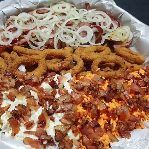 Essa porção são 2 batata (1kg) - Com cheddar, Catupiry e bacon, 20 unidade de anel de cebola e o nosso maravilhoso Pão de alho.