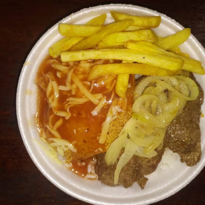 Arroz, feijão, frango a parmegiana, bife acebolado e batata frita.