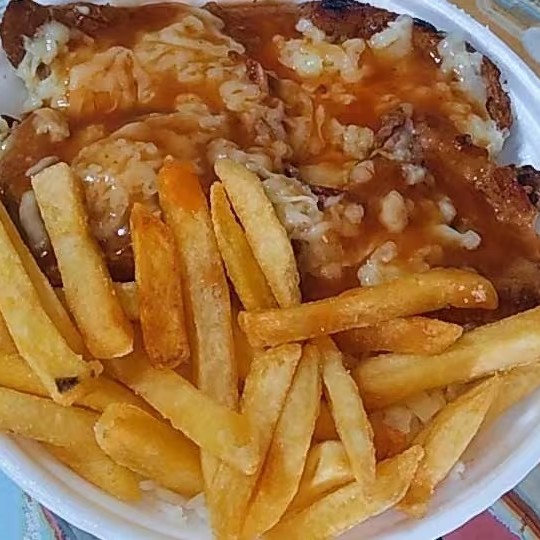 a Saboroso Bife com molho de Tomate Queijo, e também Batata Frita.
