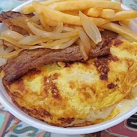 a Saboroso Omelete com Queijo e Bife, e também Batata Frita.