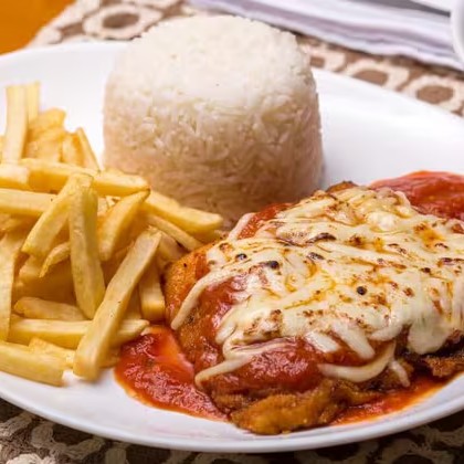 Arroz, Feijão, frango parmegiana, Batata frita.