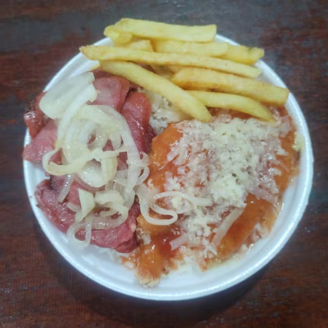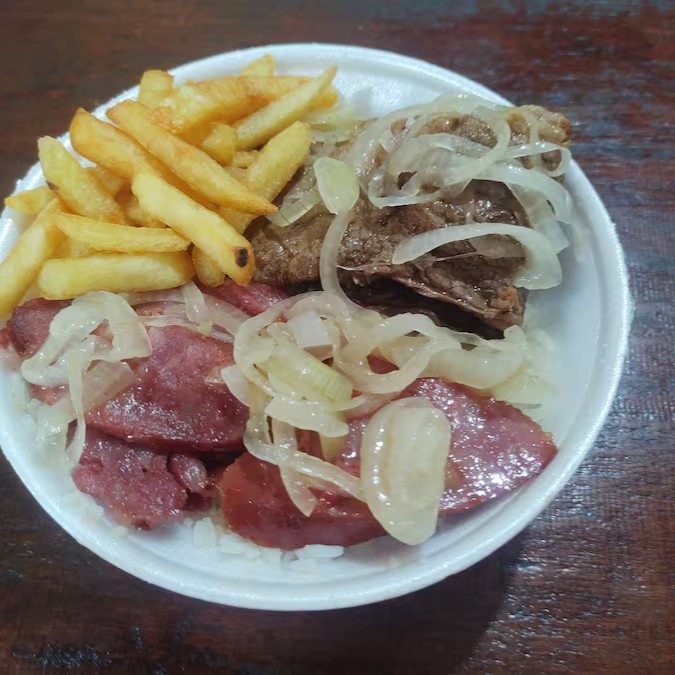Arroz, feijão, bife acebolado, calabresa e batata frita