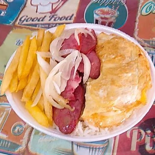 Arroz , Feijão , Calabresa acebolada e Batata frita.