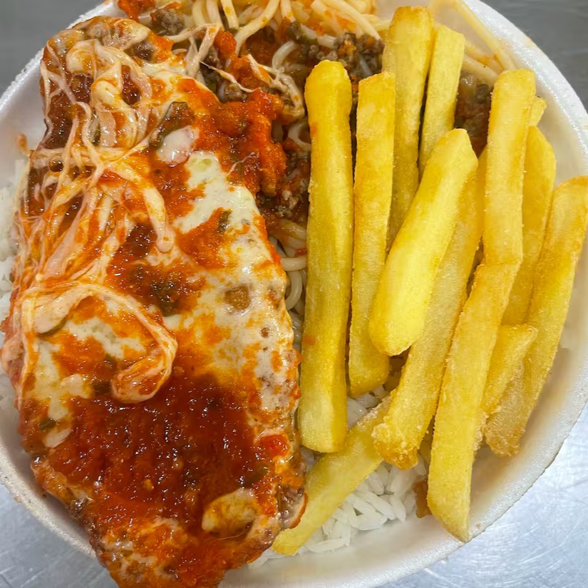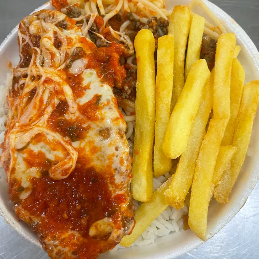 arroz, feijão, bife grelhado, frango empanado, batata frita