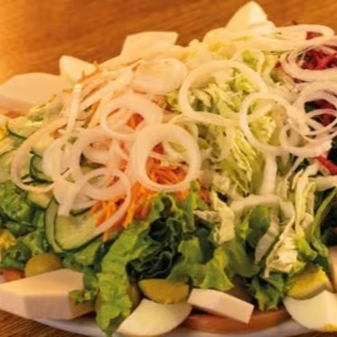 Alface , rúcula, cebola, tomate, cenoura, beterraba, repolho, pepino, palmito, ovos e azeitona
