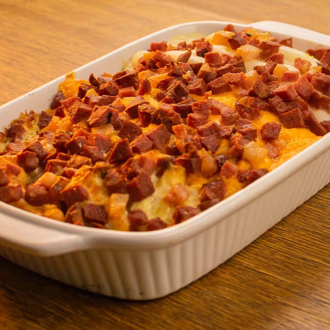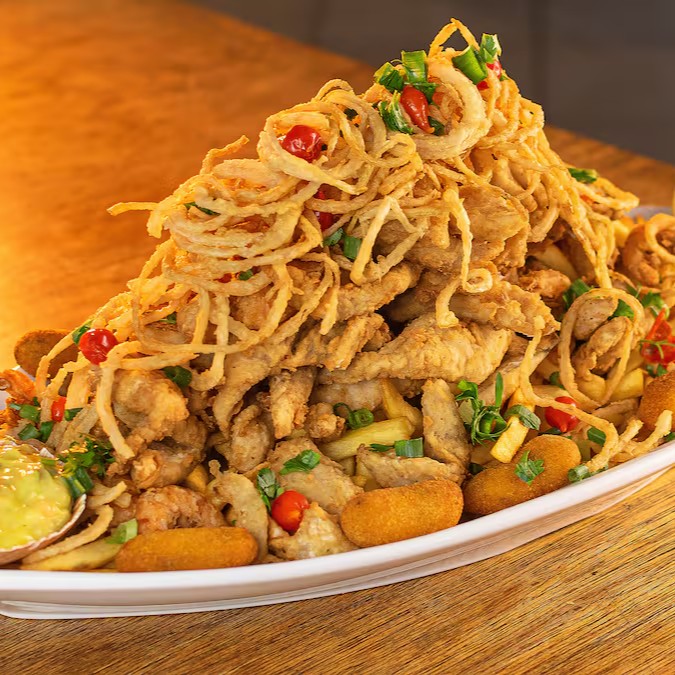 Batata frita com mussarela, cheddar, Catupiry, tiras de bacon e calabresa