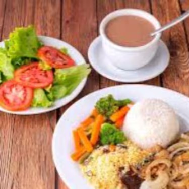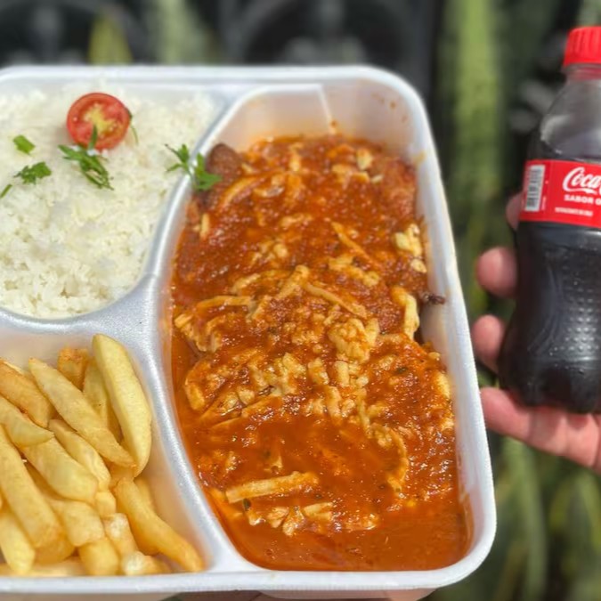 Marmitex serve bem uma pessoa, vai Arroz branco, batata frita e a Parmegiana de frango. Acompanha coca cola 200ml e de sobremesa um chocolate