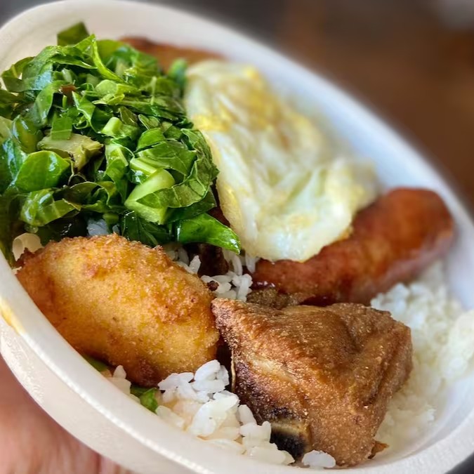 Arroz branco, tutu de feijão, bisteca, costelinha, ovo frito, banana a milanesa, couve refogada.