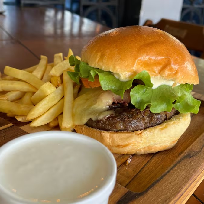 Pão de hambúrguer, hambúrguer de picanha e chedar. Acompanha fritas e molho artesanal de alho.
