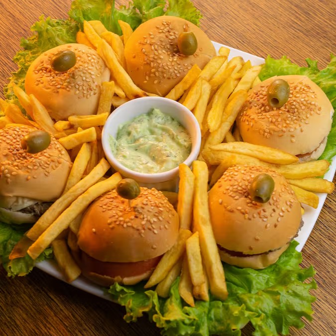 6 Mini hamburgues, pão, hamburguer, tomate, queijo, molho da casa. Acompanha batata frita
