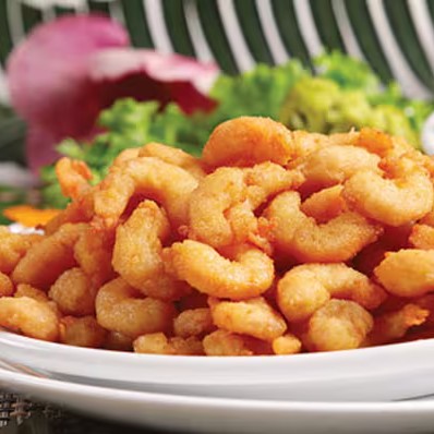 Arroz branco, strogonoff cremoso de camarão e batata frita. Uma combinação irresistível!