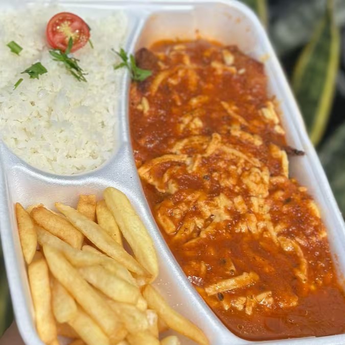 Frango à parmegiana, arroz soltinho e batata frita crocante. Porção caprichada na medida certa!