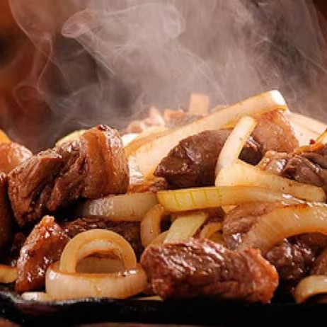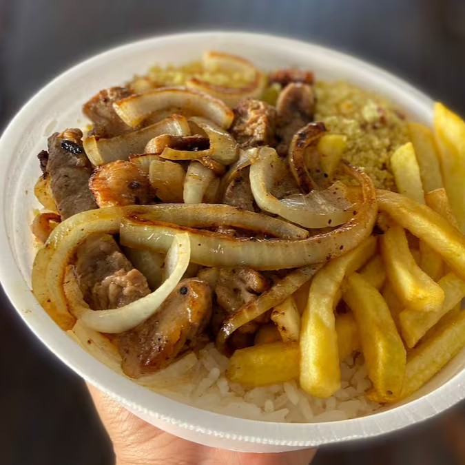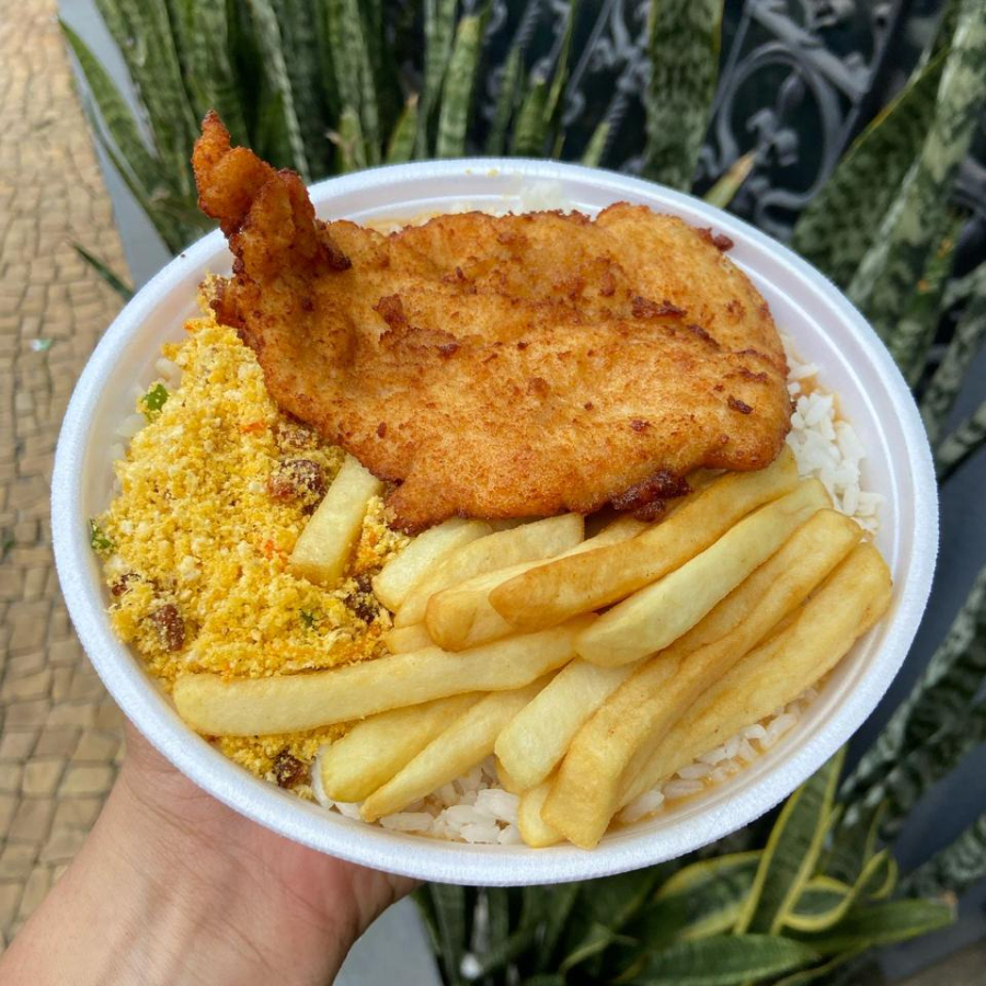 Arroz branco, Feijão, Batata frita e Contra Filé acebolado