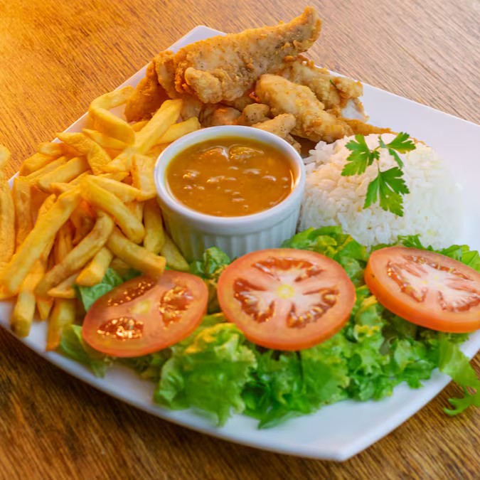 Tilápia empanada ao molho e queijo, acompanhado de arroz soltinho e batata frita crocante. Combinação clássica e deliciosa!