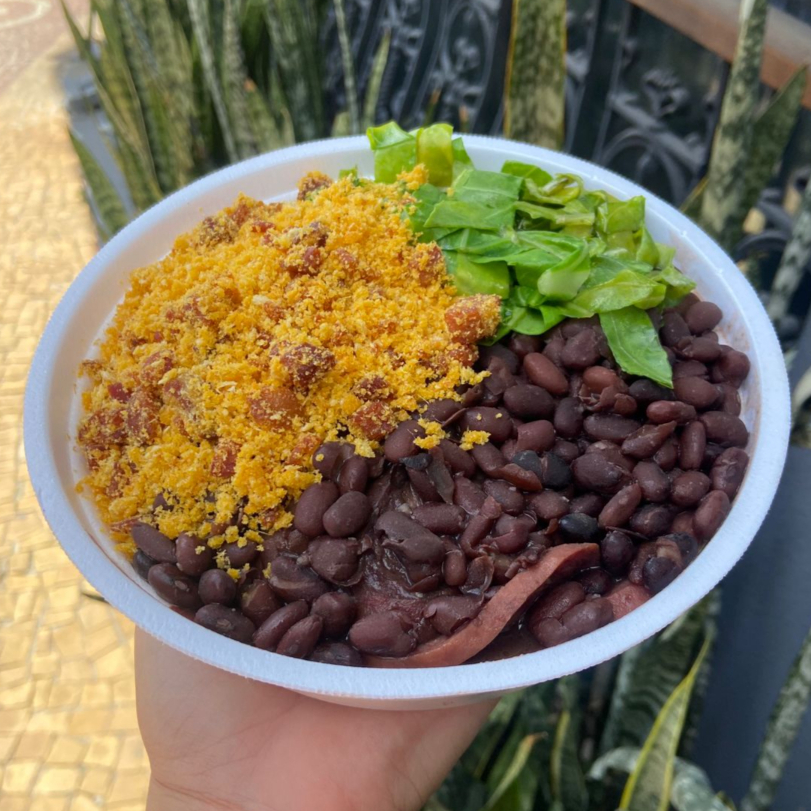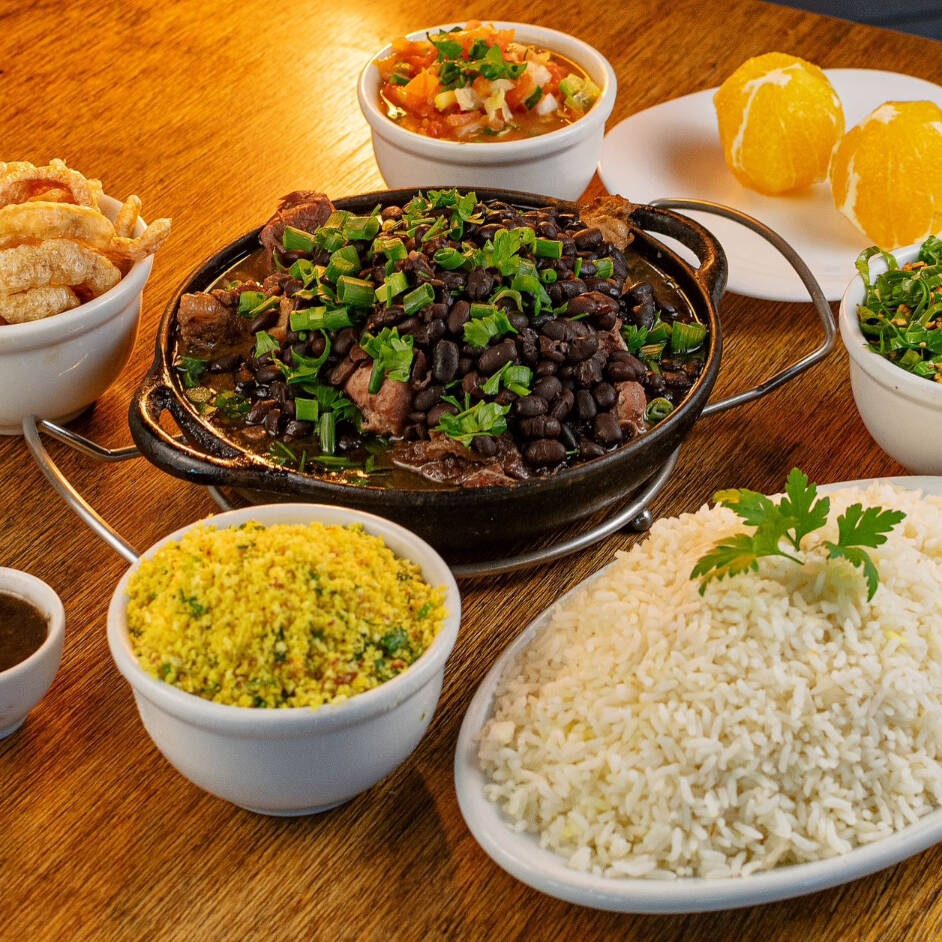 A Feijoada é completa Arroz branco, couve refogada, farofa, vinagrete e pururuca. Ideal para dividir.