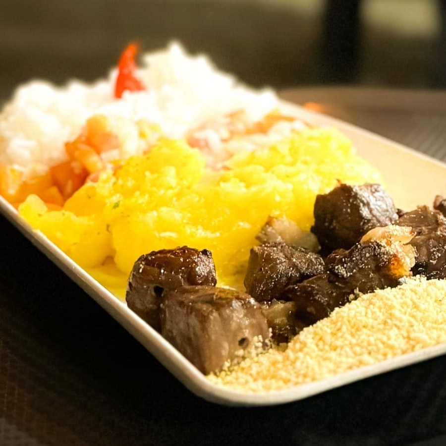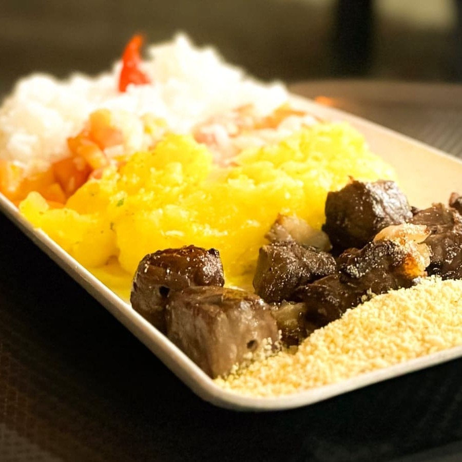Jantinha acompanhada de Arroz, Vinagrete, Mandioca cozida e sua carne favorita.