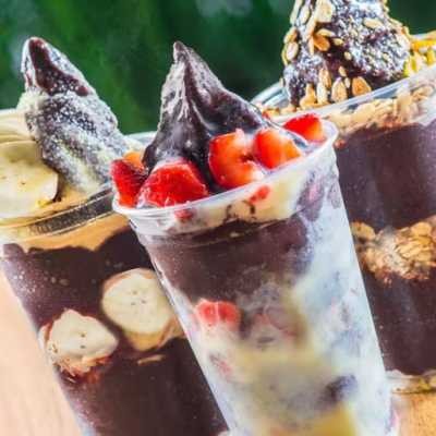 Açaí Natural, Morango, Banana , Uva e Leite condensado.