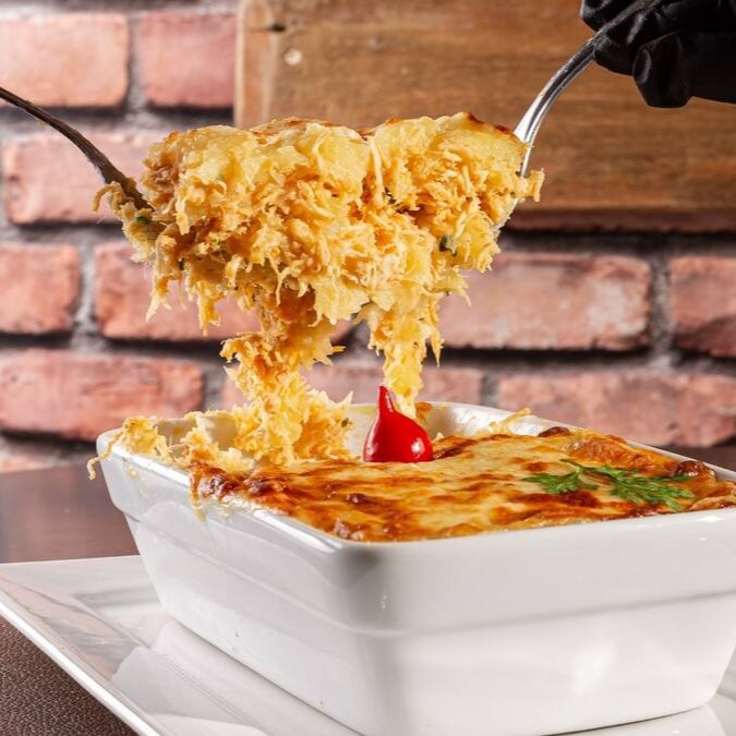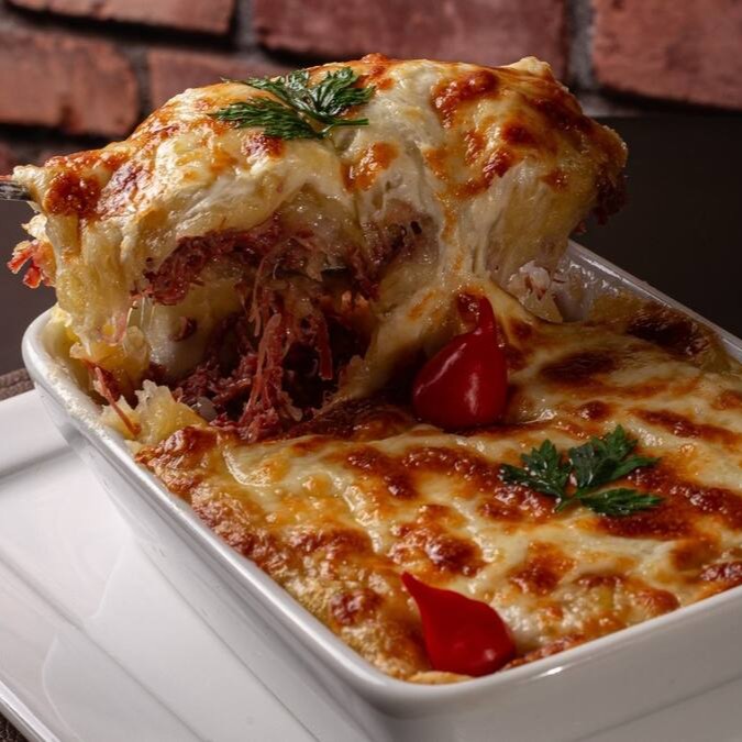 Nem é todo mundo que capricha no gratinado, por isso o nosso é perfeito: com muçarela, recheio de carne seca desfiada e cebola. Aproximadamente 420g.