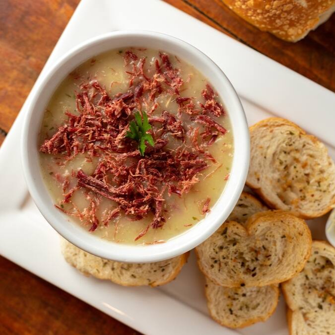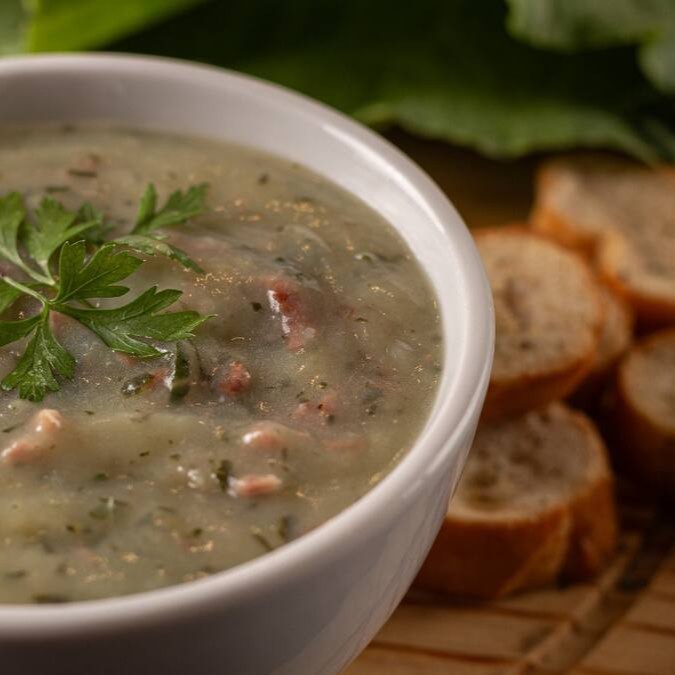 Perfeição é a definição para esse caldo. À base de batata, couve, calabresa ralada e cheiro-verde. Acompanha: queijo ralado, sachê de molho de pimenta, torrada ou torresmo.