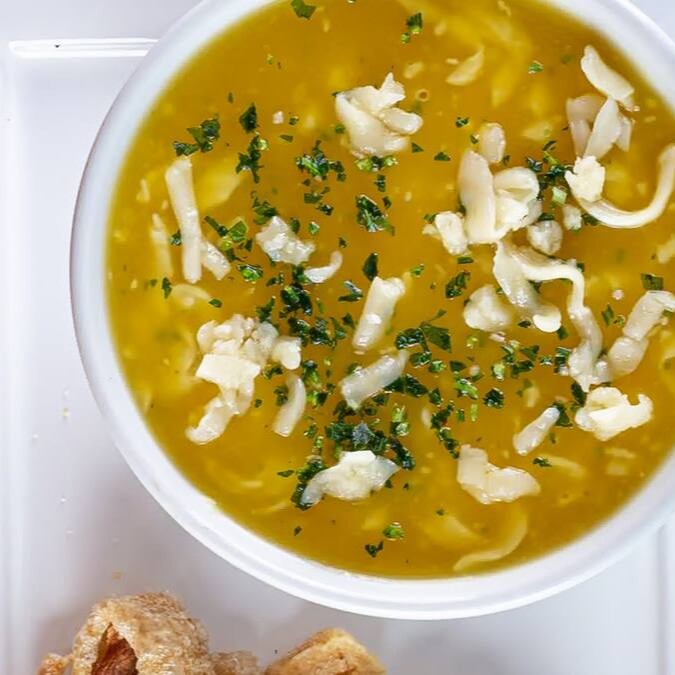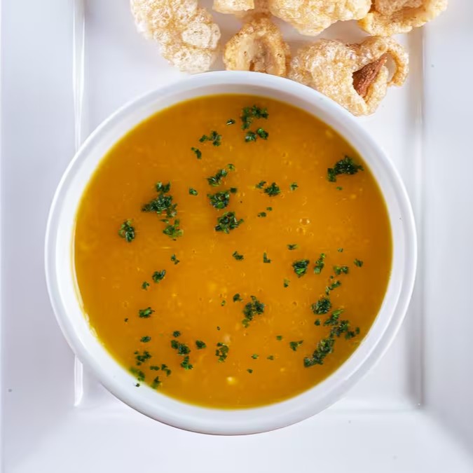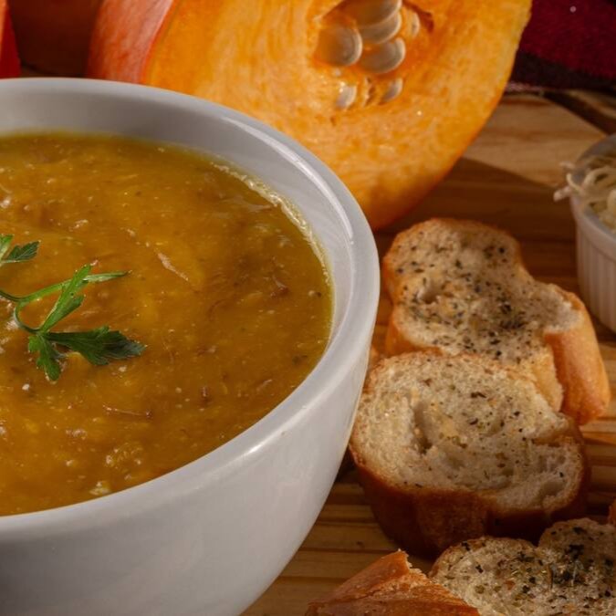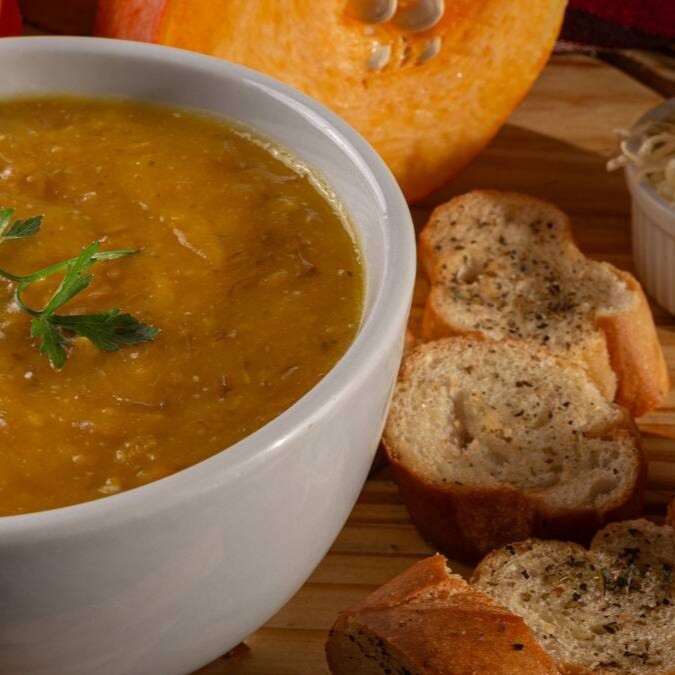 Delicioso Caldo de Mandioca e Abóbora Cabotiá com costela desfiada e cheiro verde. Tudo com um tempero caseiro especial. Acompanhamentos: Queijo ralado e Sachê de Molho de Pimenta, torrada ou torresmo.