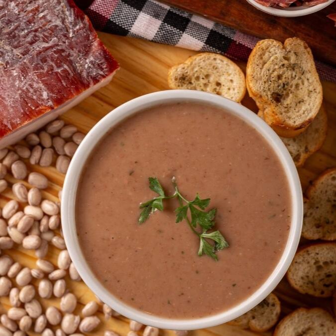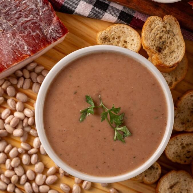 Como não poderia faltar: caldo de feijão carioquinha com bacon, calabresa e cheiro-verde. Acompanha: queijo ralado, sachê de molho de pimenta, torrada ou torresmo.