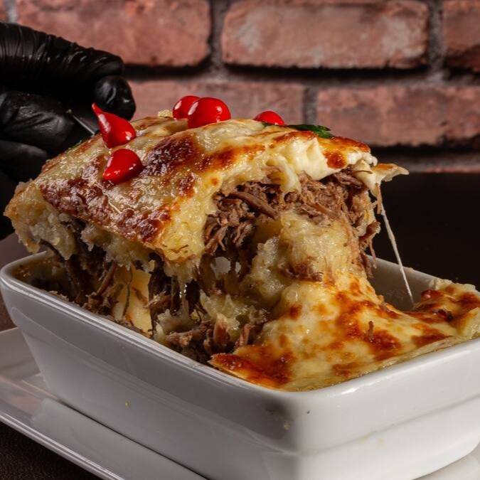Gratinadíssimo com muçarela, recheado com costela bovina desfiada. Aproximadamente 420g.
