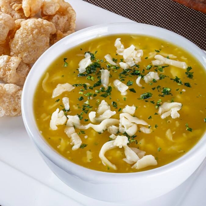 Sabores que se completam! Caldo de mandioca com muçarela e cheiro-verde. Acompanha: queijo ralado, sachê de molho de pimenta, torrada ou torresmo.