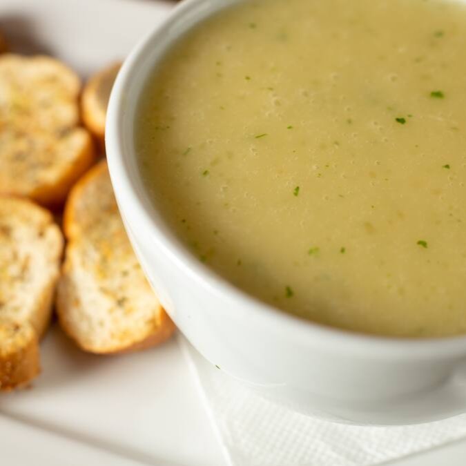 Só usamos o diminutivo no nome, pois o sabor é sensacional: caldo de mandioquinha com muçarela e cheiro-verde. Acompanha: queijo ralado, sachê de molho de pimenta, torrada ou torresmo.