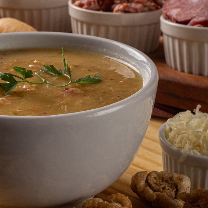Como não poderia faltar: caldo de feijão carioquinha com bacon, calabresa e cheiro-verde. Acompanha: queijo ralado, sachê de molho de pimenta, torrada ou