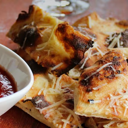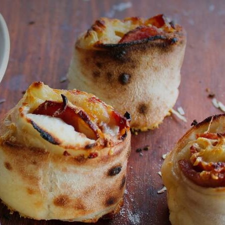Rolinhos de massa recheados com mozzarela fior de latte, calabresa e parmesão gratinado. Acompanha molho de tomate temperado (6 unidades).
