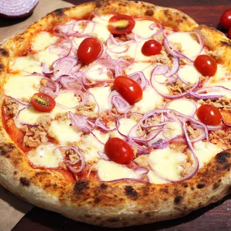 Molho de tomate da casa, mozzarela fior de latte, atum sólido, tomate grape confit e cebola roxa fatiada