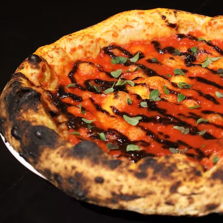 Molho de tomate da casa, pasta de alho negro, orégano fresco e finalizada com flor de sal