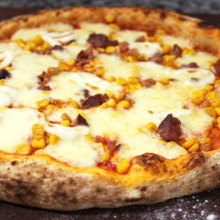 Molho de tomate da casa, mozzarela fior de latte, milho, bacon de papada em cubos e requeijão de corte Atalaia