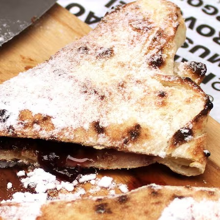 A mesma massa leve da pizza, recheada com a clássica Nutella em combinação com uma deliciosa geleia de amora. Polvilhado com açúcar de confeiteiro.
