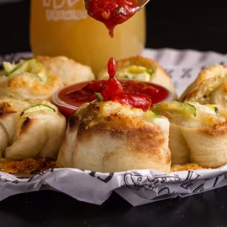 Rolinhos de massa recheados com mozzarela fior de latte, abobrinha,requeijão de corte Atalaia e parmesão. Acompanha molho de tomate (6unidades)