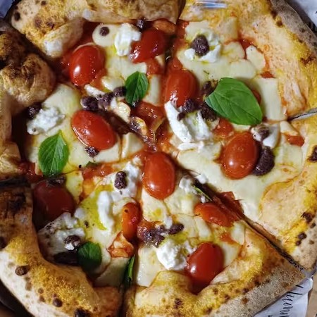 Molho de tomate, mozzarela fior de latte, pedaços de muçarela de búfala fresca, tomate grape confit, pesto de azeitona preta e manjericão