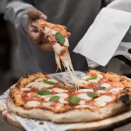 Molho de tomate da casa, mozzarela fior de latte, parmesão e manjericão